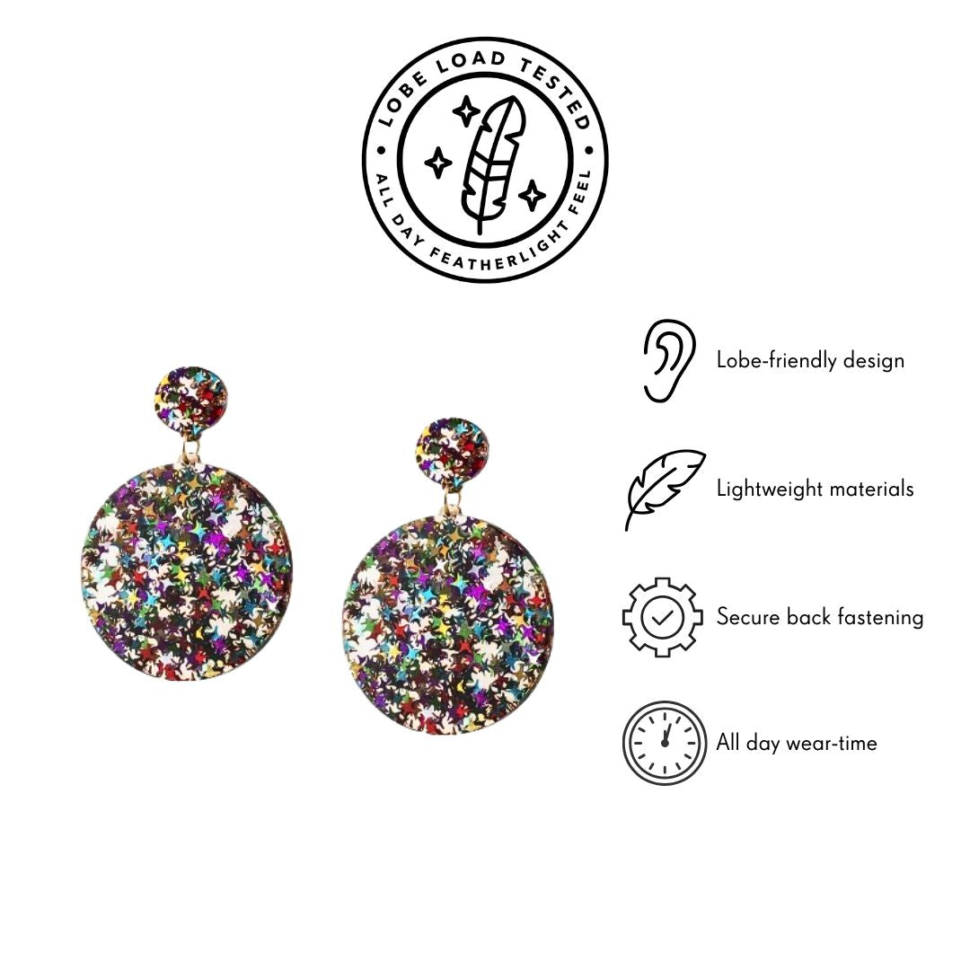 In the mood to stand out from the crowd? Then put on the glitz with these rainbow star-studded disc drop earrings. Party pizazz personified, this statement star couple will put a spin in your step and all eyes on your ears.